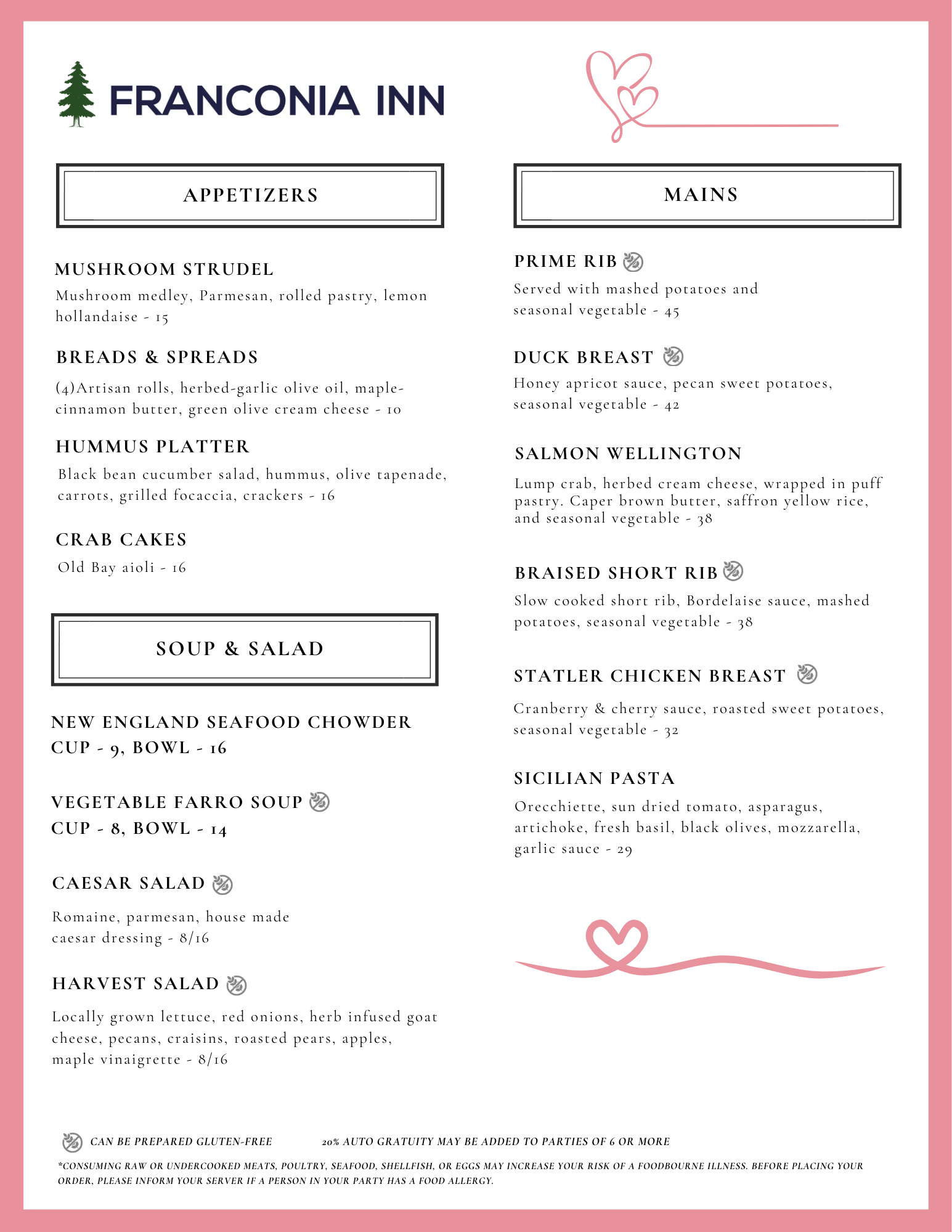 Special, one-night-only menu. Reservations are limited, please call to reserve a table. Serving dinner in both our pub and dining room.